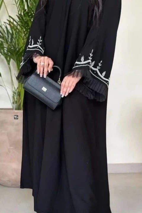 - وتفصيلة التطريز الأبيض على الأكمام تضفي على العباية لمسة من الفخامة والتميز.